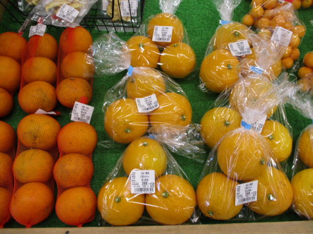 地元産の野菜では、さつまいもやちぢみほうれん草、白菜、甘夏みかん等が並んでいます。
