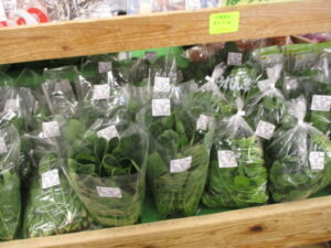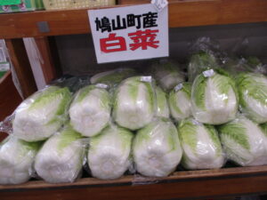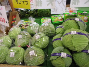 地元産の野菜では、キャベツや白菜、ほうれん草、椎茸、ブロッコリー等が並んでいます。
