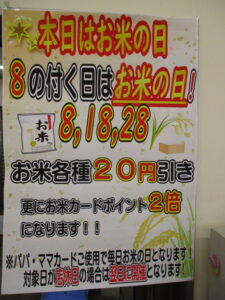 お米も8のつくお米の日ではないですが、1㎏20円引き、ポイントカード2倍を行っています!(本日限定)