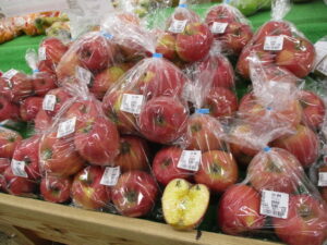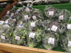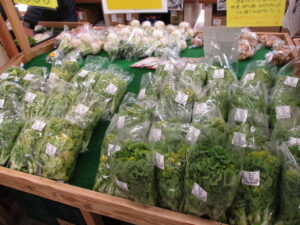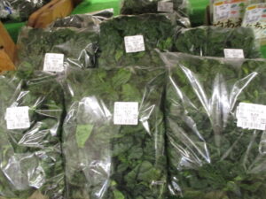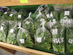 地元産の野菜では、ちぢみほうれん草や茎ブロッコリー、菜花、ほうれん草等が並んでいます。