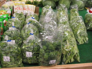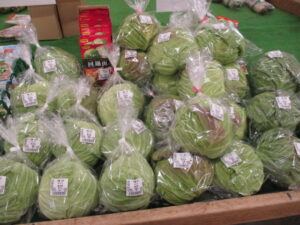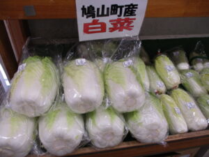 地元産の野菜では、白菜やキャベツ、菜花、ほうれん草等が並んでいます。