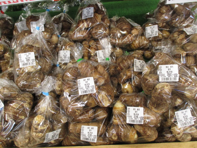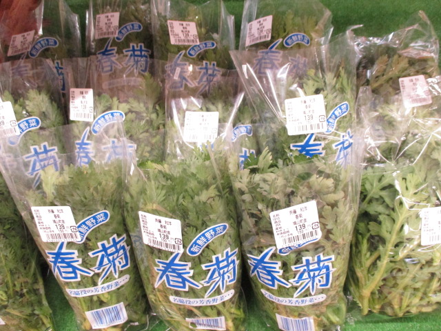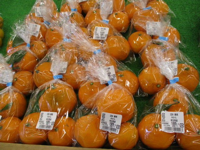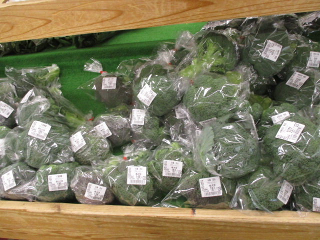 地元産の野菜では、春菊やほうれん草、里芋、ブロッコリー、みかん等が並んでいます。