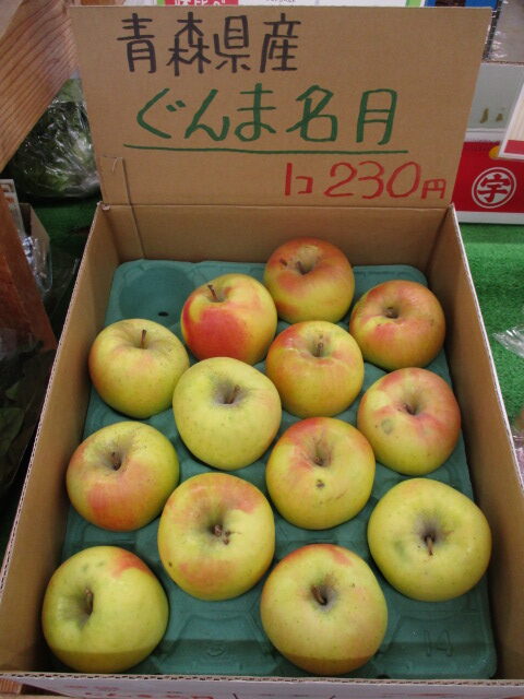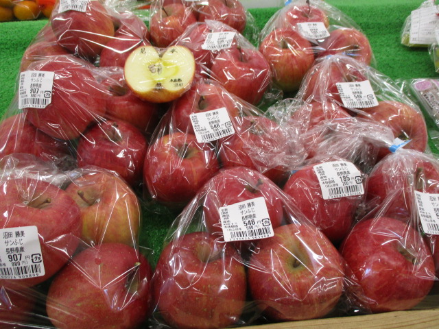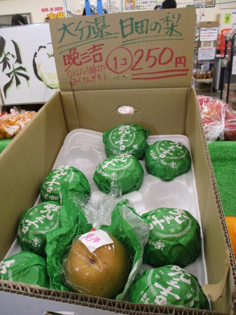 果物では、日田の梨や長崎みかん、農家さんのサンふじ等が並んでいます。