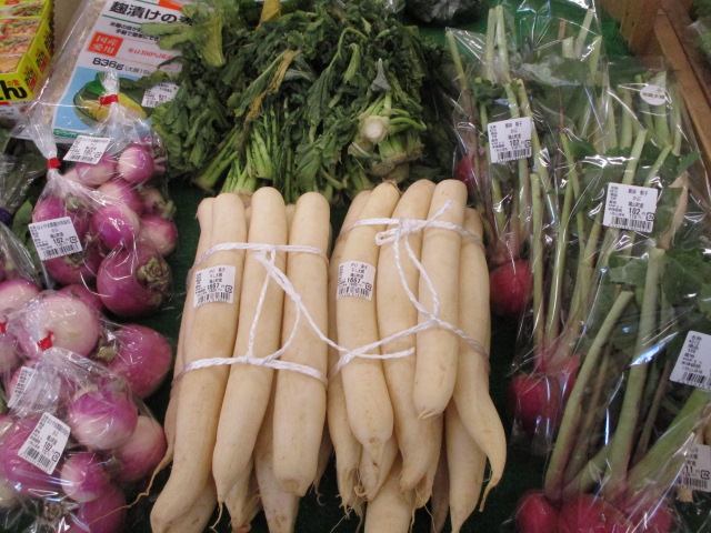 地元産の野菜では、ヤーコンや干し大根、白菜、長ねぎ等が並んでいます。
