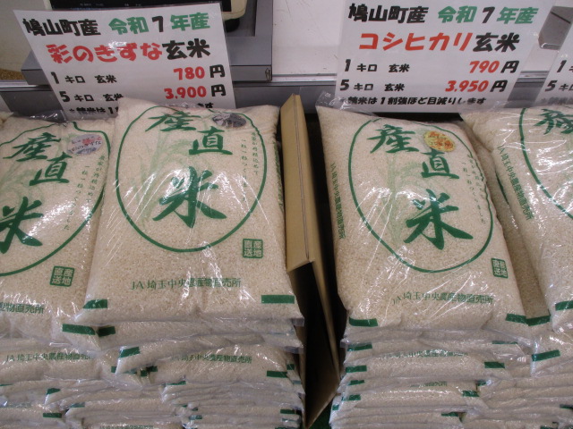 お米では、鳩山産の新米を販売しております。品種は彩のきずなとコシヒカリです!