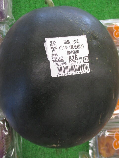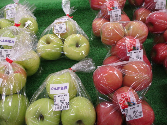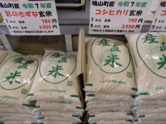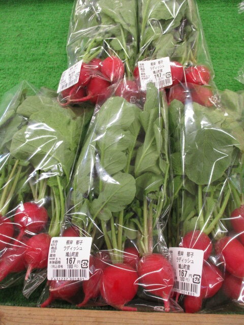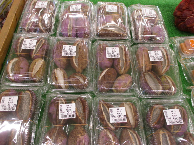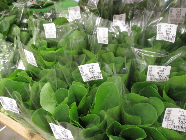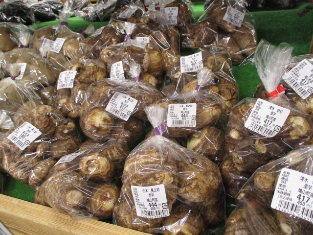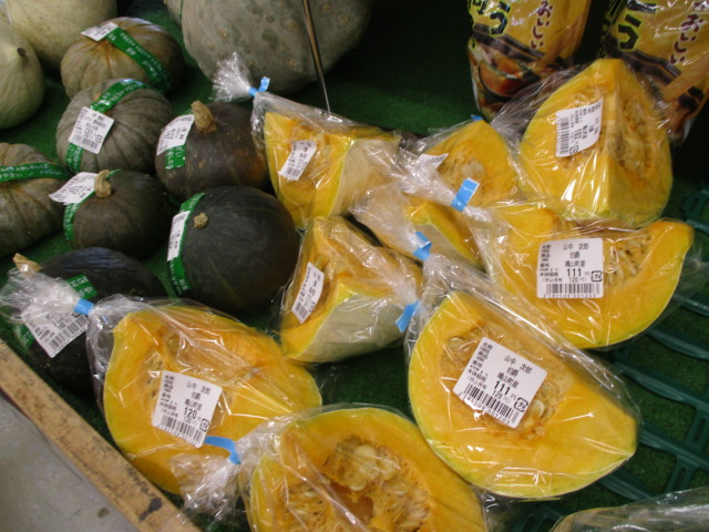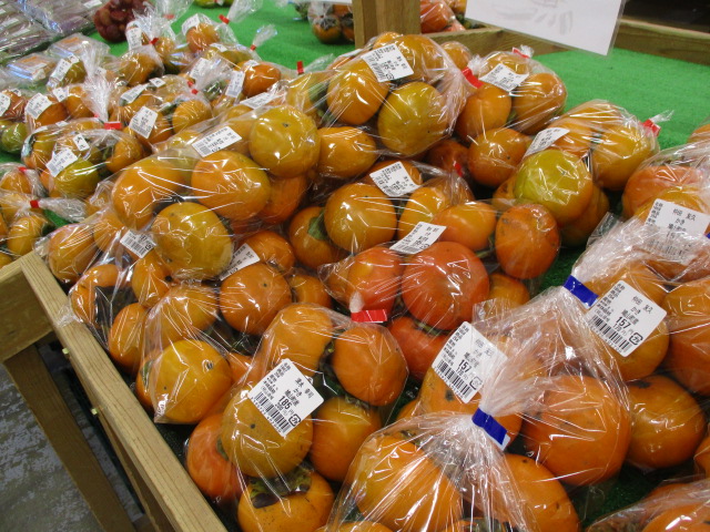 地元産の野菜では、柿やラディッシュ、小松菜、里芋、カボチャ等が並んでいます。