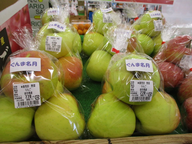 りんごでは、ぐんま名月とサンふじが並んでいて、4玉入のぐんま名月(大玉)は840円とお買得商品となっております!
