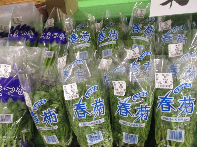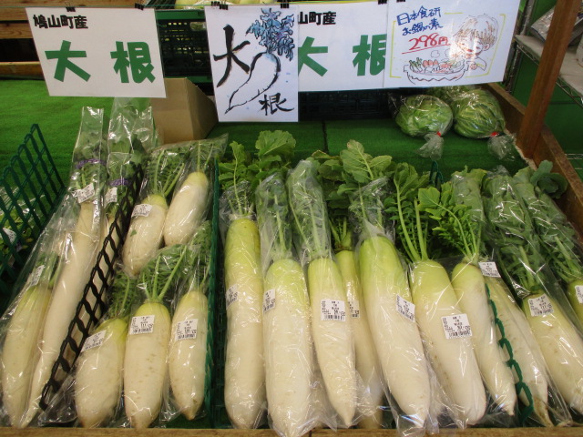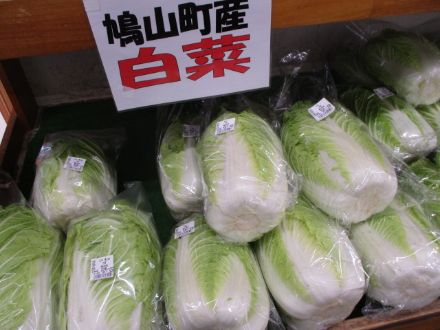 地元産の野菜では、白菜や大根をはじめ、春菊、ちぢみほうれん草等が並んでいます。