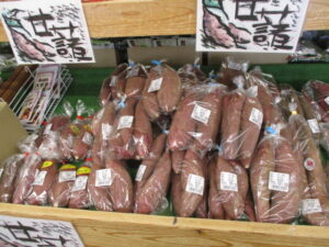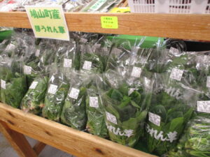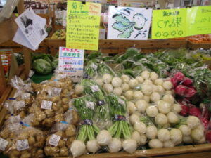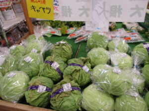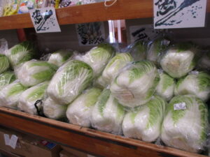地元産の野菜では、キャベツや菊芋、ほうれん草、かぶ、白菜等が並んでいます。