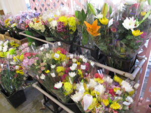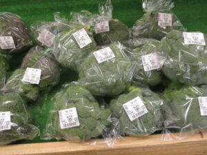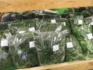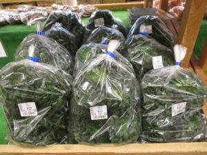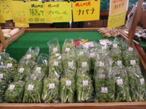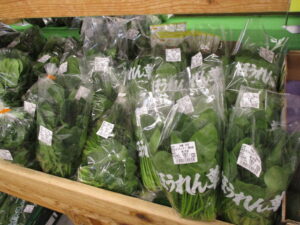 地元産の新鮮野菜では、タアサイやちぢみほうれん草、ブロッコリー、菜花、ほうれん草、白菜等が並んでいます。