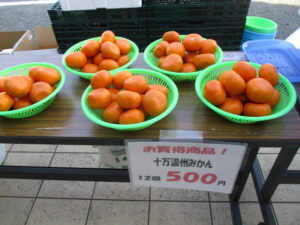 また、干物販売の横でみかんのザル盛り販売を行なっています!品種は十万温州みかんで、12玉500円と大特価です!