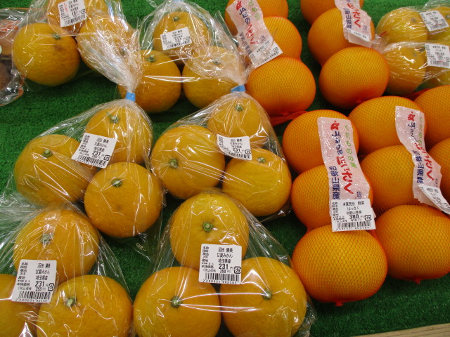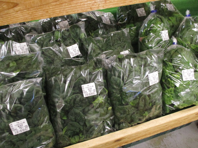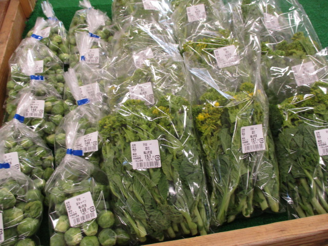 地元産の野菜では、甘夏みかんやちぢみほうれん草、芽キャベツ、長ねぎ、白菜等が並んでいます。