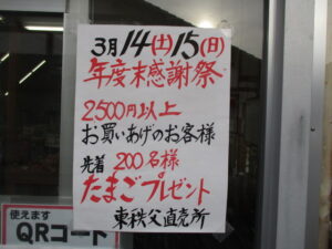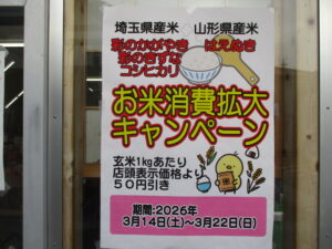おはようございます。明日3月14日から3月22日の間、消費者応援キャンペーンとして、お米(玄米1kgあたり50円)の値引きを行います。埼玉県産こしひかり・彩のきずな・彩のかがやき、山形県産はえぬきをご用意致しました。また、3月14日は好評につき駅弁の販売、3月15日は峠の釜めしの販売を致します。いずれも数量に限りがありますので、お買い求めの際はお早めにお越しください。またまた、両日共に2,500円以上お買い上げの方に先着200名様にたまご(1パック6個入り)をプレゼント致します。