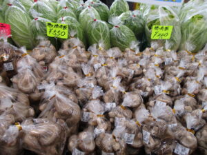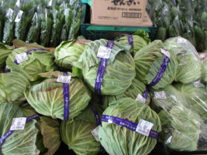キャベツ、しいたけ、ねぎ、白菜等、採れたて新鮮野菜も入荷しました。