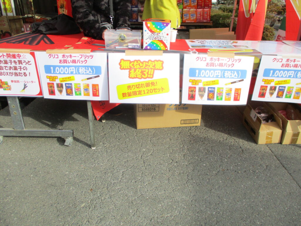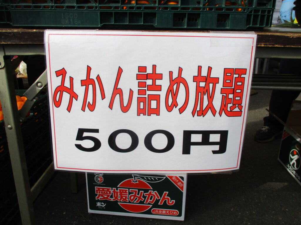 直売所入り口では、果物外売り特売、ポッキー販売、みかん詰め放題を開催しております。