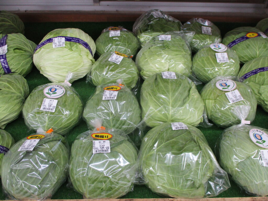 大根、白菜、かぶ、キャベツ、春菊等の滑川町産の採れたて新鮮野菜が棚にびっしりと並べられています。