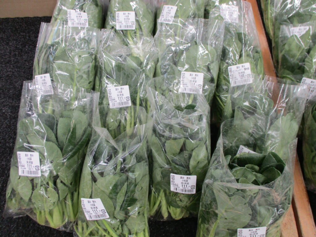 本日、ほうれん草、のらぼう菜、小松菜といった葉物が豊富に入荷しました。