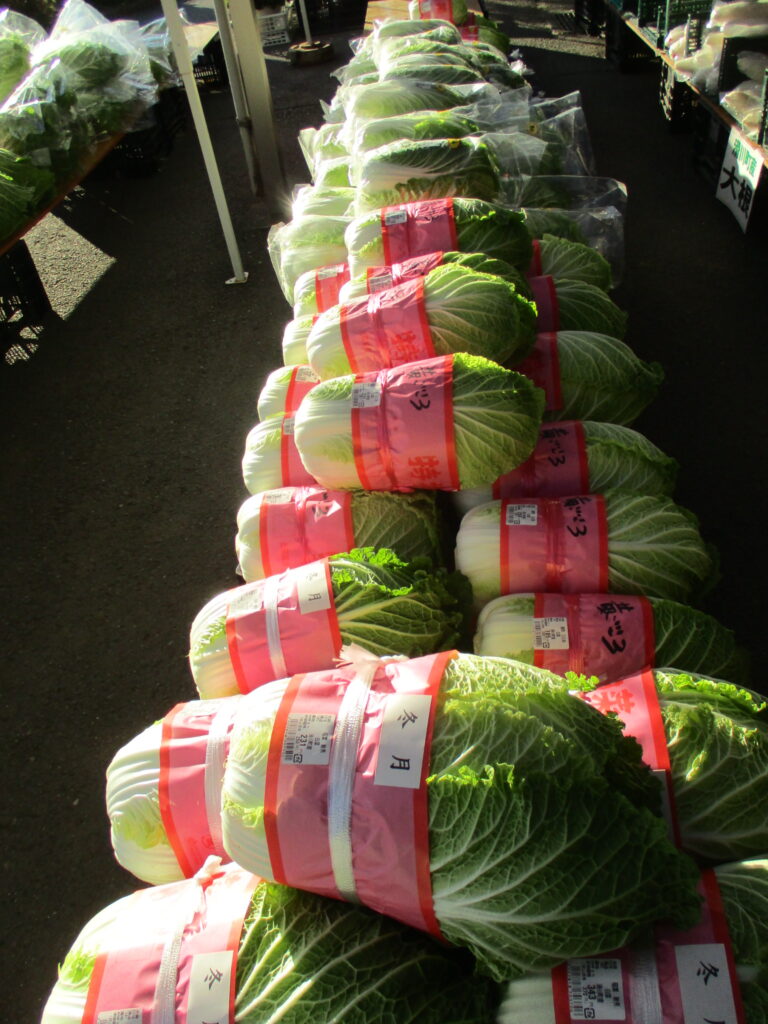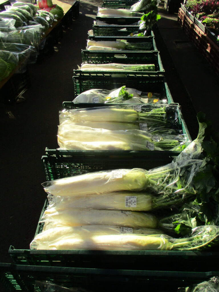 本日も白菜、大根、ブロッコリー、ねぎ、ほうれん草等の旬を迎えた採れたて新鮮野菜が豊富に入荷しております。特に大根は一押しの商品です!