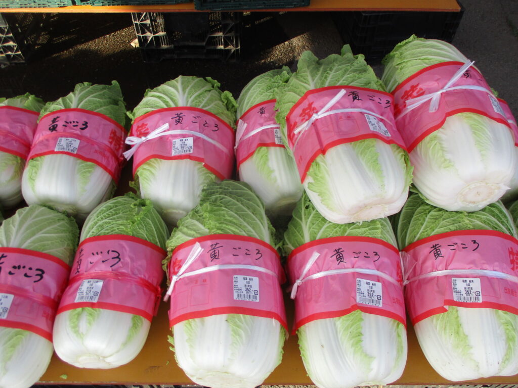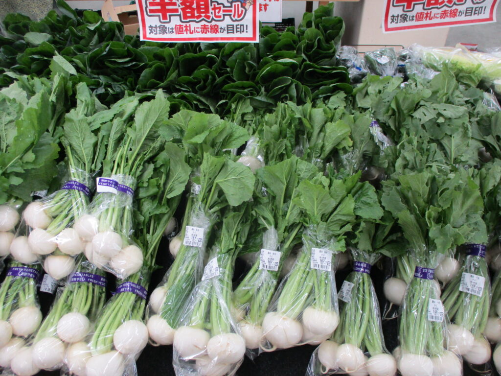 かぶ、大根、白菜、小松菜等の滑川町産の採れたて新鮮野菜が豊富に並べられています。
