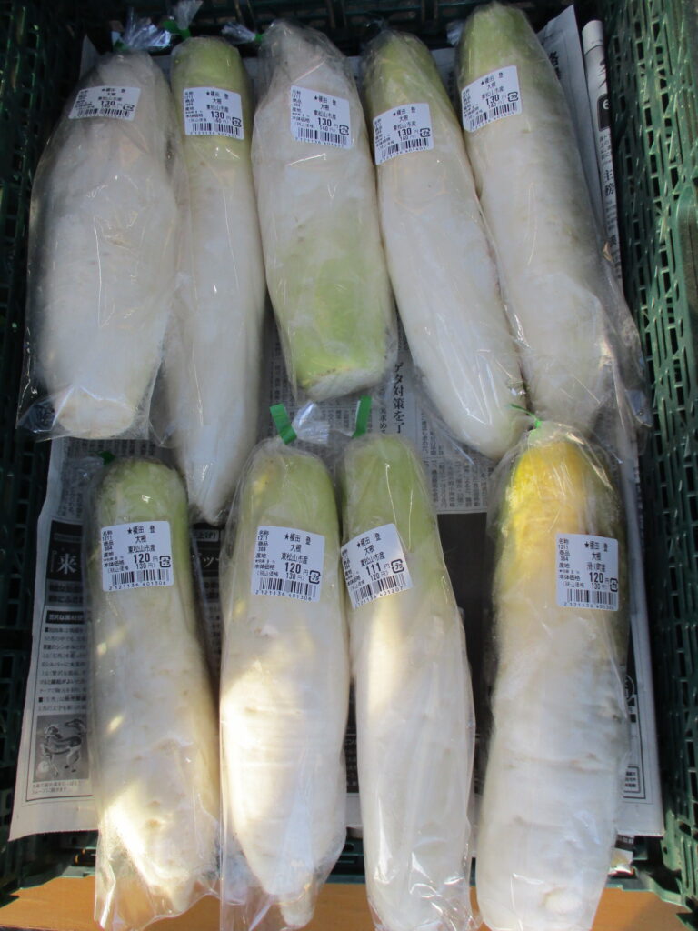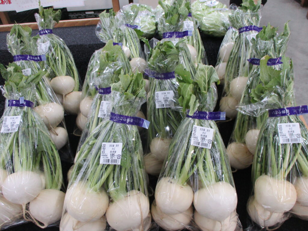 白菜、大根を外のブースに展開し販売しています。