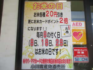 お米の日は、お米各種が1kgあたり20円引きと大変お得なサービスとなっております。今月は明日8日が早速の「お米の日」となりますので、この機会に是非美味しい新米をお買い求めください。