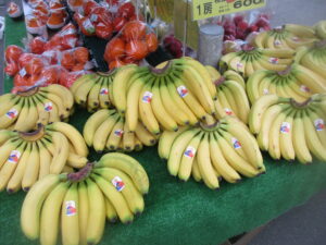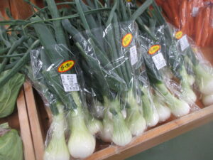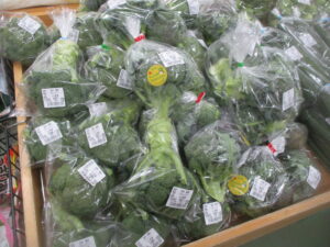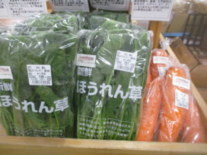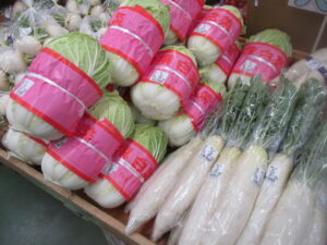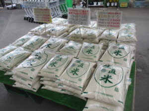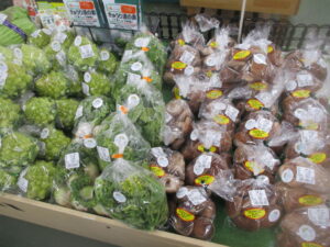 本日は白菜、ブロッコリー、葉玉ねぎなどの地元野菜を入荷している他、外売りコーナーではお米、苺やバナナなどを販売中です。