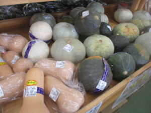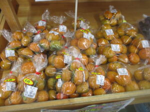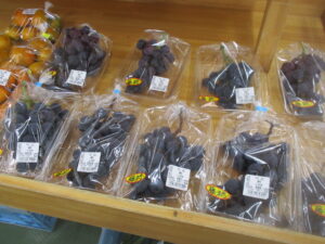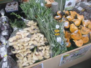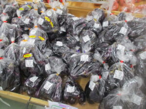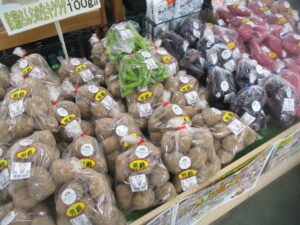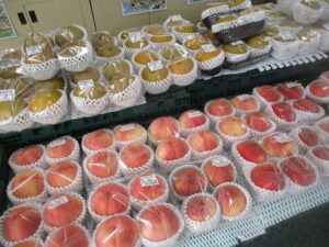 その他、地元産のジャガイモ、なす、葉しょうがや、果物では梨、桃、りんごなどを販売中です。