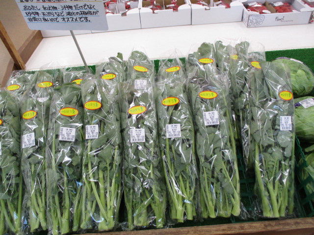 おはようございます。のらぼうなが入荷中!のらぼうなはクセが少なくお浸しやバター炒め、パスタに入れても美味しいです。また、栄養も豊富です。是非ご賞味ください お知らせ・・・フラワーセンターにて、じゃがいもの種が入荷中。JAカードのご利用でカード代金ご請求時に5%割引になります。 皆様のご来店お待ちしております。