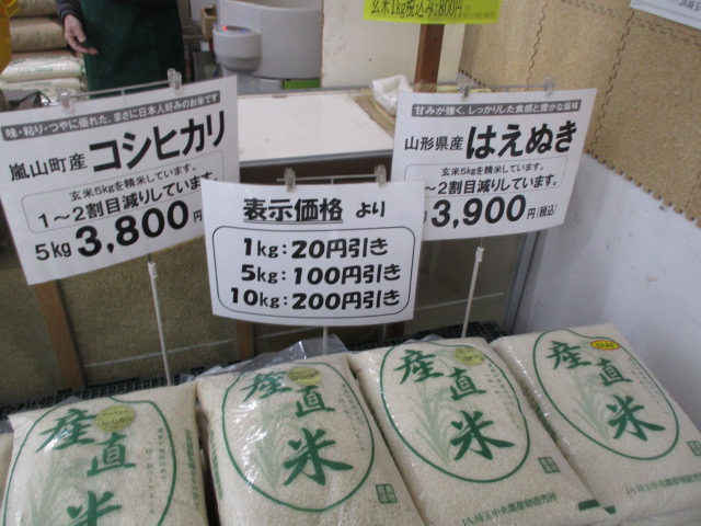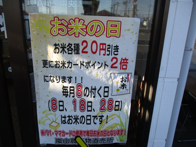 おはようございます。本日、お米の日でお米の特売日です。お米各種1kgあたり20円引きになります。また、お米カードのポイント2倍になります。皆様のご来店お待ちしております。