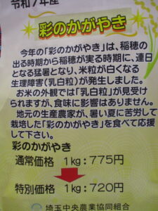 また「彩のかがやき」は猛暑の影響により、粒の大きさが小さい事や乳白粒という事で低価格でのご提供となります。精米による目減りも2割前後となってります、ご了承くださいませ。食味には変わり無いので安心して美味しく頂けます。